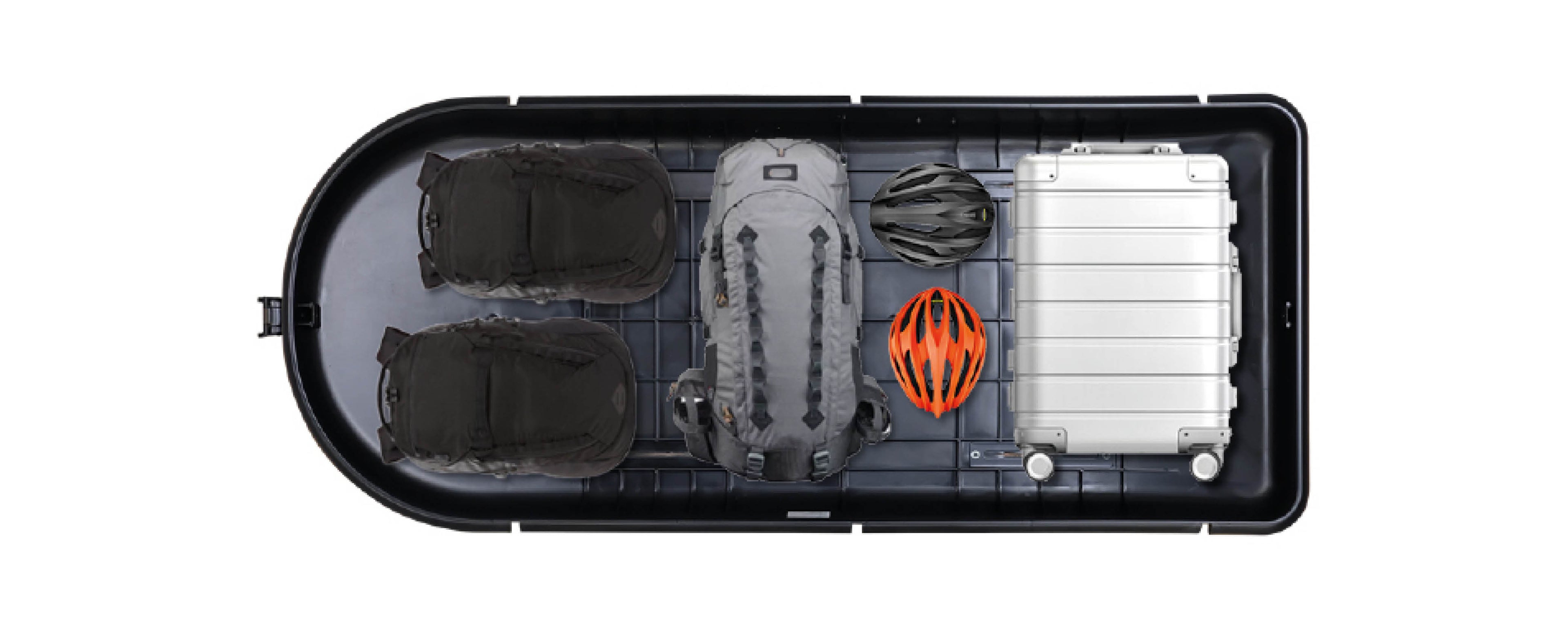 Box da tetto con coperchio in polipropilene nero. Il box è completamente impermeabile e trattato per resistere ai raggi UV e ai graffi. Il fondo è dotato di alette in plastica all'interno per evitare movimenti accidentali del carico. Il box è dotato di una serratura laterale centralizzata e di un gancio di sicurezza anteriore.